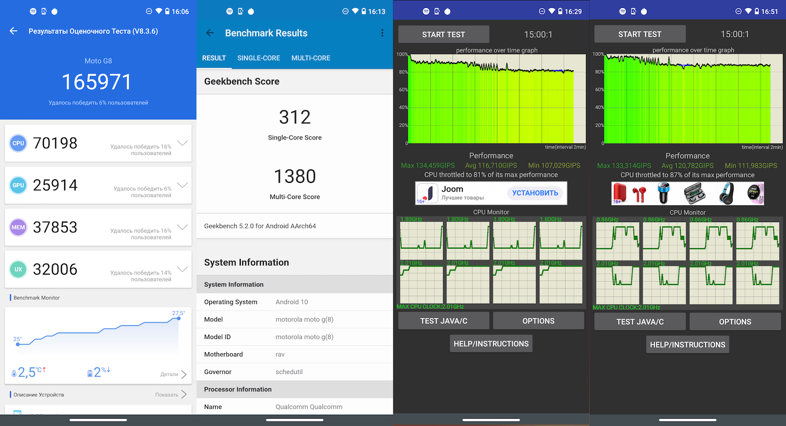 В синтетическом тесте PCMark, при яркости экрана близкой к 200 кд/м², Moto G8 Plus выдал результат 10 часов 19 минут.