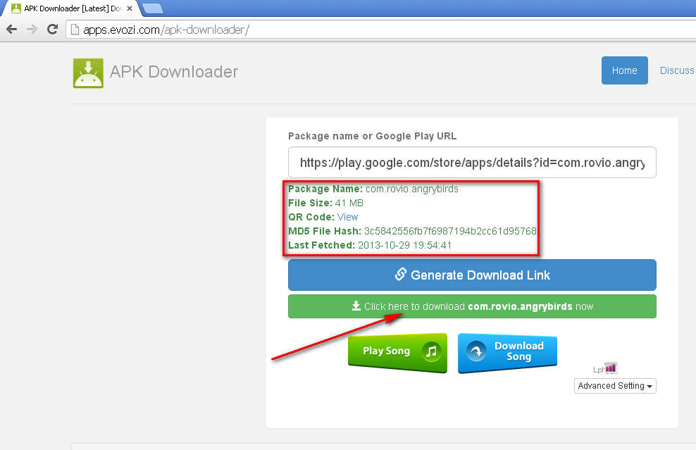 6. После обработки ссылки чуть ниже появится информация о скачиваемом apk файле и кнопка для закачки его на ваш компьютер. Нажмите ее.