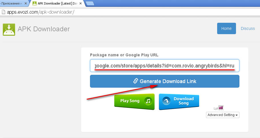 4. Откройте в браузере страницу загрузчика apk файлов apps.evozi.com и вставьте в поле Package name or Google Play URL