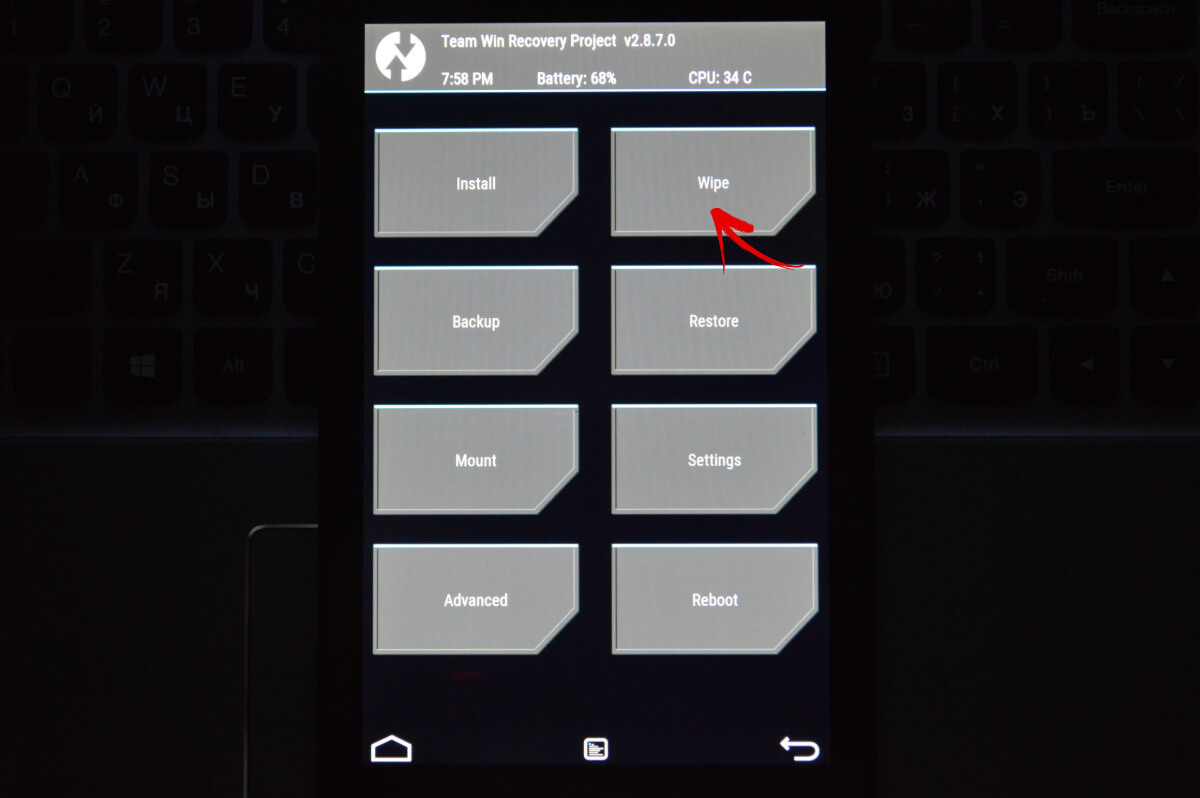 3. Теперь необходимо сбросить систему. Для этого выберите «Wipe» в главном меню.