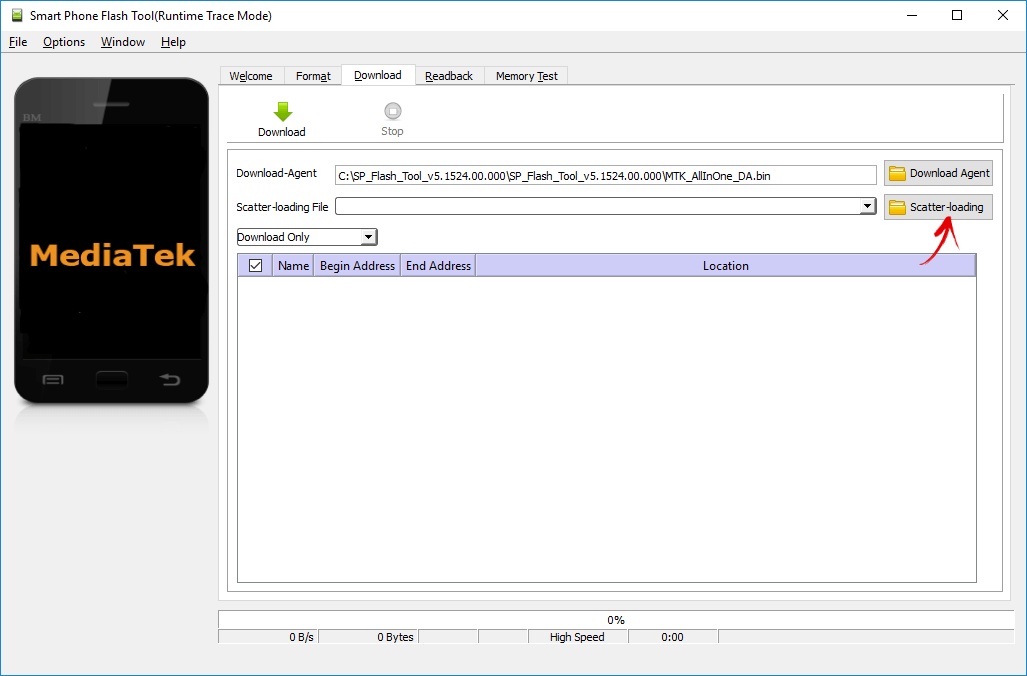 3. В поле «Download-agent» уже будет указан путь к «MTK_AllInOne_DA.bin». Далее нажать «Scatter-loading» и выбрать scаtter файл в папке с прошивкой.