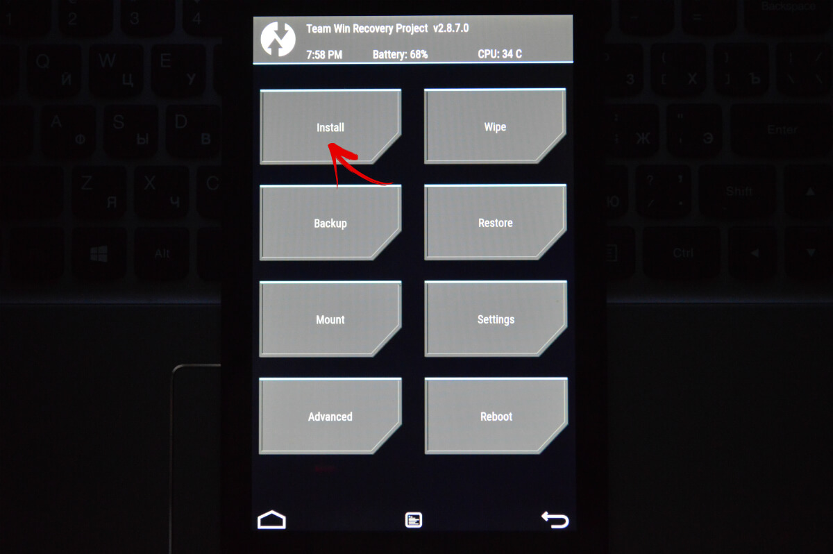 6. Вы вернетесь к главному меню TWRP Recovery. Теперь переходим непосредственно к самой прошивке. Для этого выберите «Install».