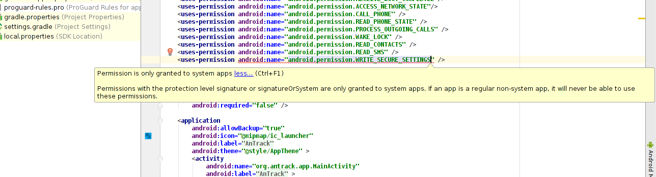 По идее, данное полномочие должно открыть доступ к API, позволяющему переводить смартфон в режим полета, включать/выключать GPS и делать другие полезные вещи. Но IDE так не считает и поэтому сразу подчеркивает строку как ошибку с формулировкой «Permission is only granted to system apps». Это и есть предупреждение о нарушении того самого уровня доступа. IDE как бы говорит нам: да, ты можешь попробовать дать своему приложению полномочие , но Android все равно не разрешит тебе использовать закрепленный за ним API до тех пор, пока ты не сделаешь свое приложение системным. А что значит «системным» в данном случае? Это значит: подпишешь его тем же цифровым ключом, каким подписана сама прошивка (иди попробуй раздобыть такой ключ у какой-нибудь Samsung или LG!).