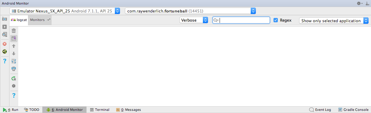 Еще одна полезная функция — logcat, это возможность просматривать сообщения об ошибке. Добавьте баг в свое вполне функциональное приложение, чтобы посмотреть, как все устроено.